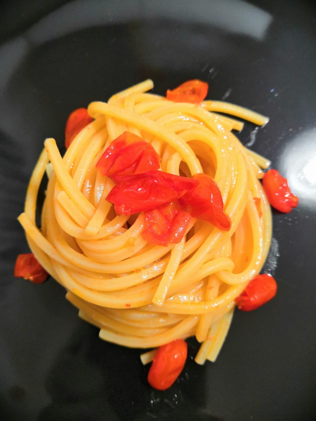 Mettete a bollire l’acqua con poco sale e nel frattempo tagliate i pomodorini a metà e fateli caramellare in padella con 1 cucchiaio d’olio di oliva e lo zucchero di canna. In una ciotola mettete l’olio rimasto, l’aglio (tagliato a metà) la scorza di mezzo limone grattugiato finemente, la colatura di alici ed emulsionare bene con una frusta.Scolate la pasta al dente e saltatela in padella con i pomodorini e dell’acqua di cottura.