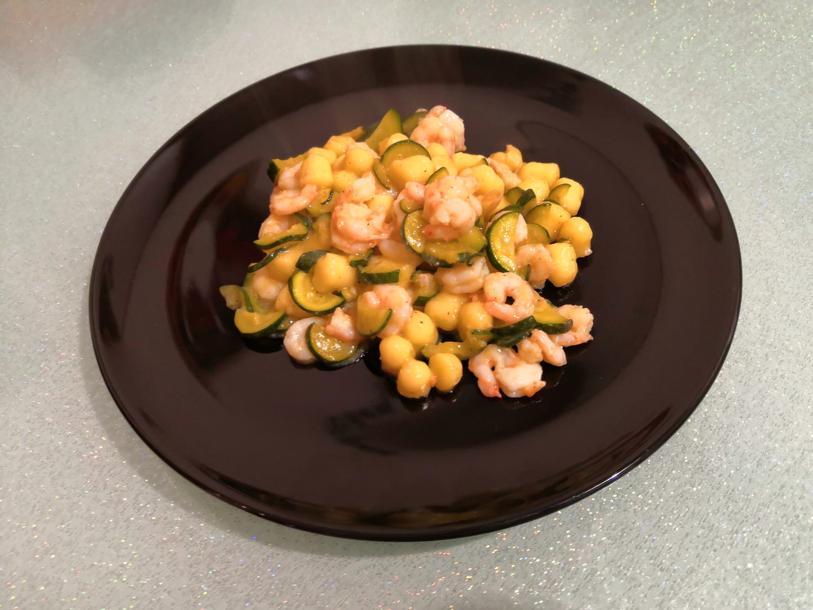 Una volta cotti gli gnocchetti scolateli e saltateli in padella con le zucchine i gamberi e del prezzemolo trirato.
