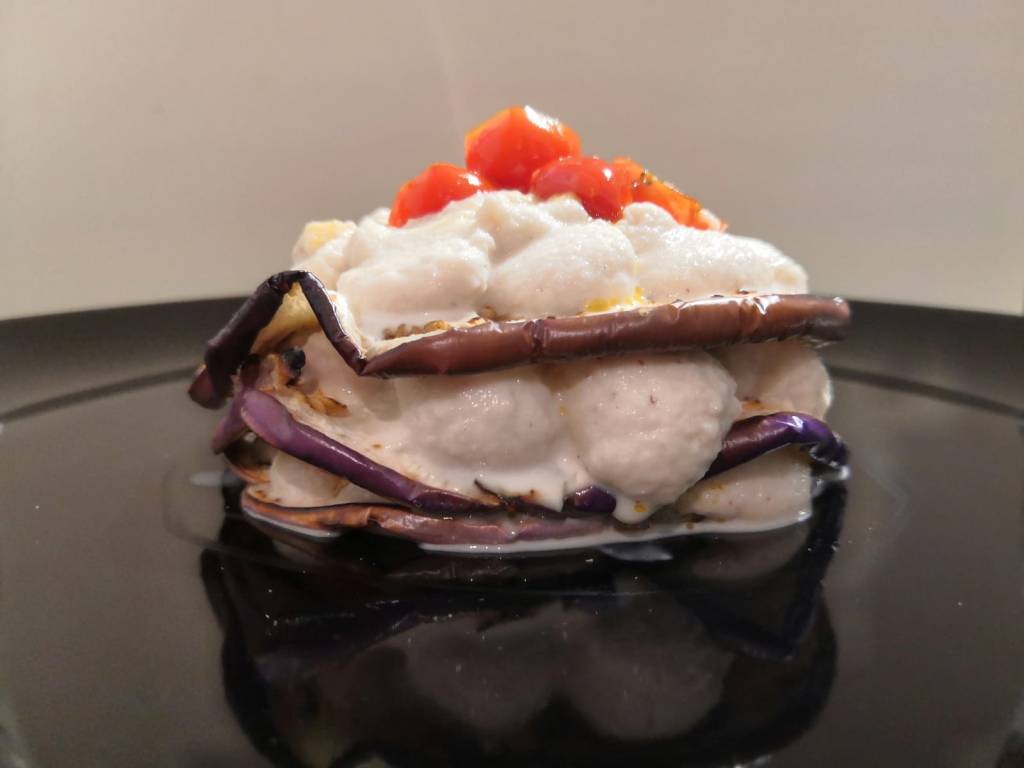 A questo punto montate il millefoglie alternando 3 fette di melanzane con la mousse di merluzzo insieme ai pomodorini.