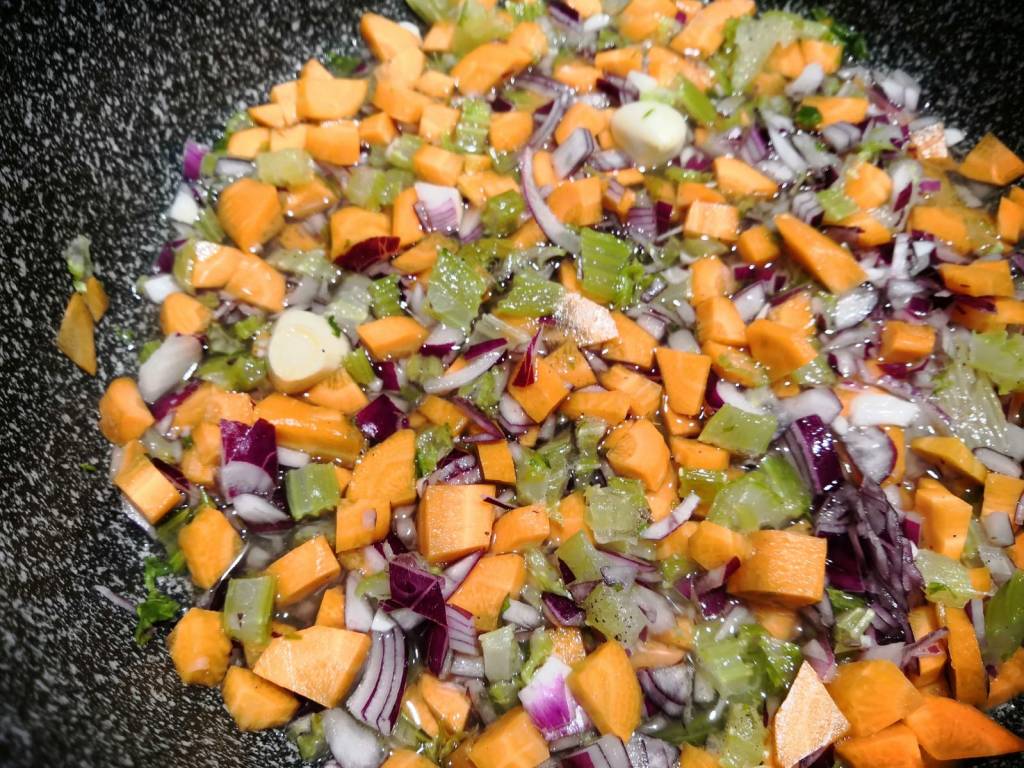 Lavare e tagliare a cubetti le carote il sedano e la cipolla e farli soffriggere con abbondante olio di oliva in un tegame per almeno 5 minuti.