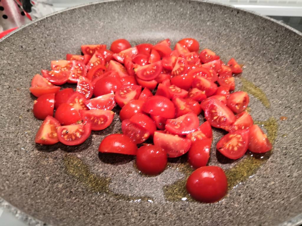 In una padella far rosolare il restante aglio con dell’olio d’oliva e poi aggiungere i pomodorini lavati e tagliati a metà e fateli cuocere per 3/4 minuti a fuoco medio. Successivamente aggiungere i filetti di merluzzo, salare a piacere e far cuocere con coperchio per 10 min a fuoco basso.