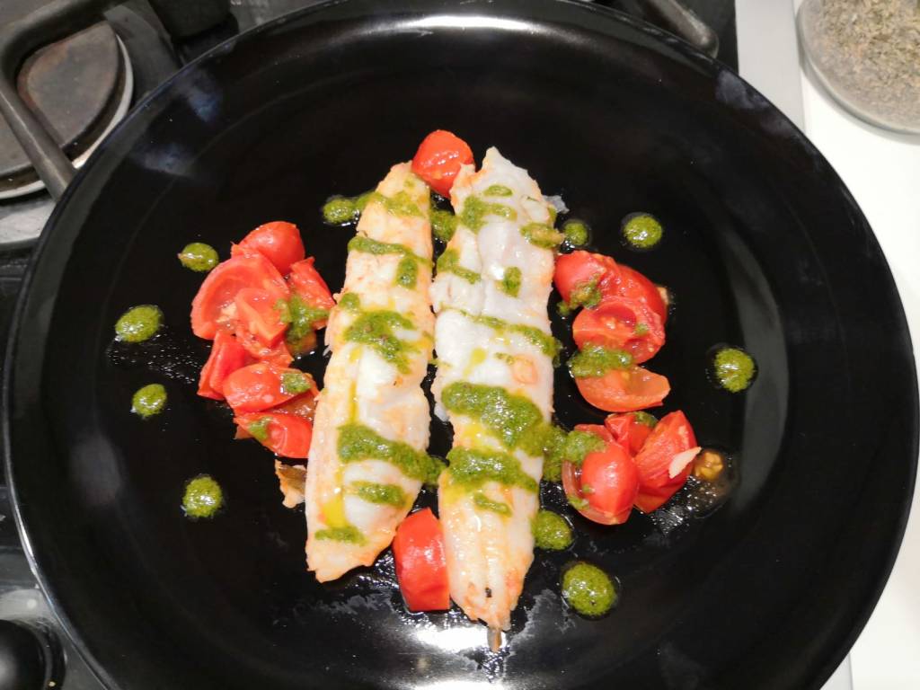 Pulire e sfilettare i merluzzi e mettere da parte, lavare il basilico e fare un pesto con l’aiuto di un frullatore unendolo a 4 cucchiai di olio, uno spicchio di aglio, i pinoli ( tostati precedentemente in una padella per pochi minuti) e il sale a vostro piacimento.
