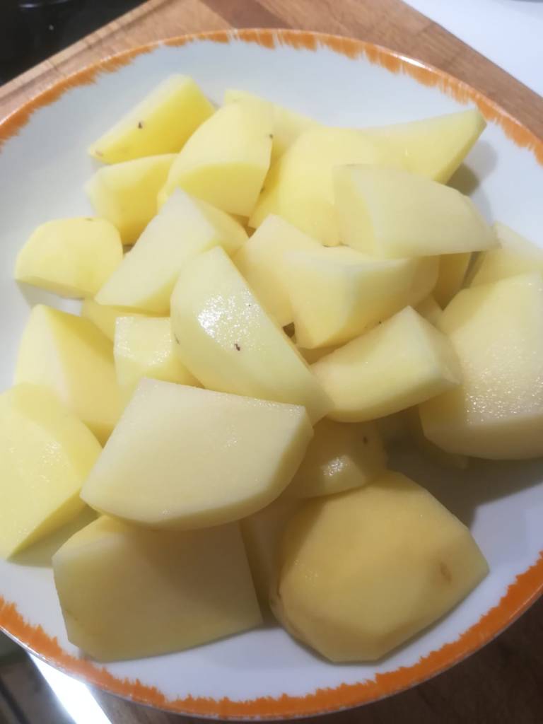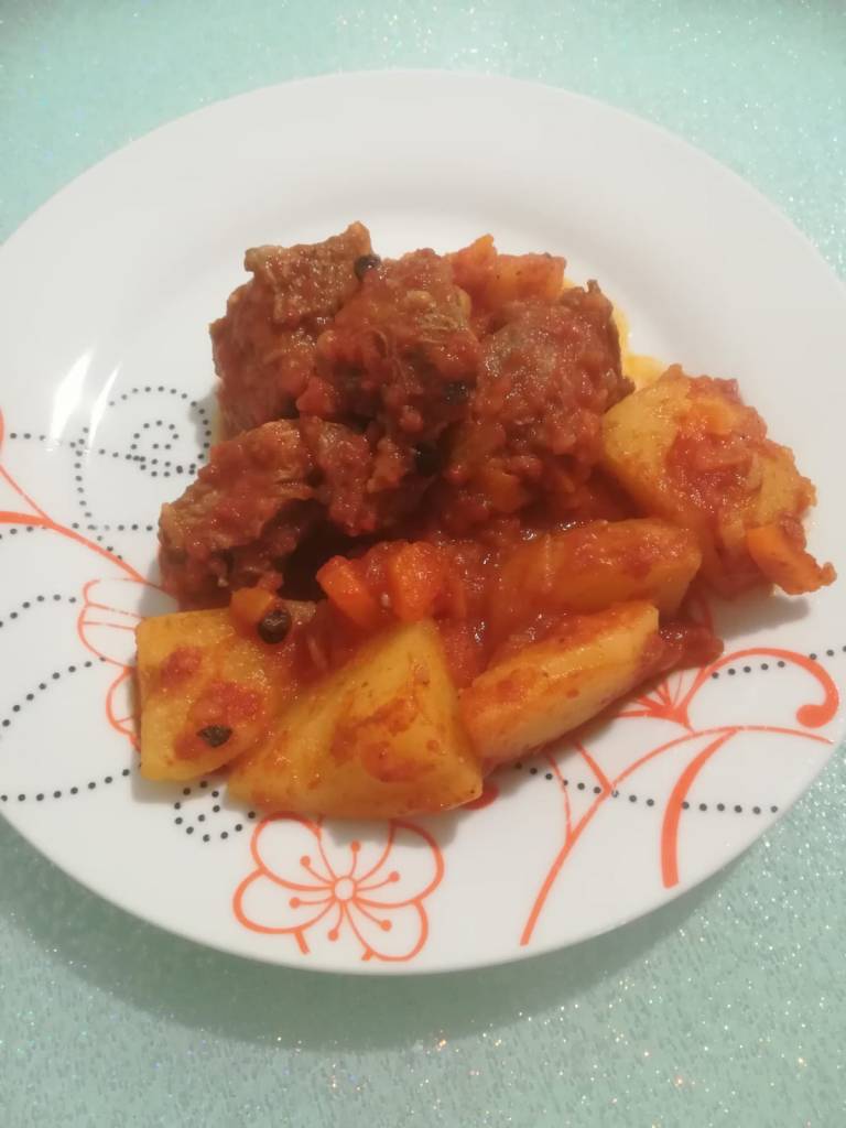 Continuare la cottura per almeno un’ora a fuoco basso mescolando ogni tanto. Successivamente, pelate le patate e tagliatele a pezzi ed aggiungetele alla carne e continuare la cottura per un’altra ora sempre a fuoco basso.