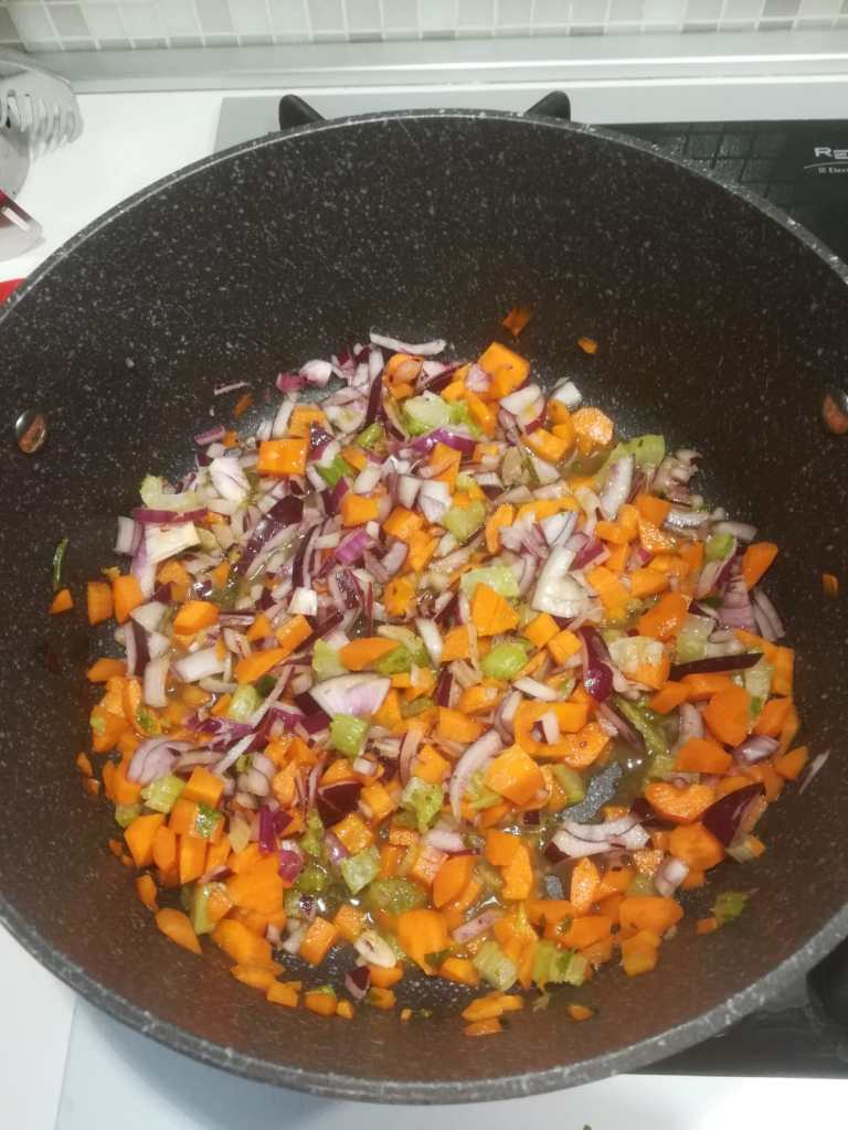 Lavare, pelare e tagliare a cubetti le carote, il sedano e la cipolla e soffriggere con olio per almeno 5 minuti.