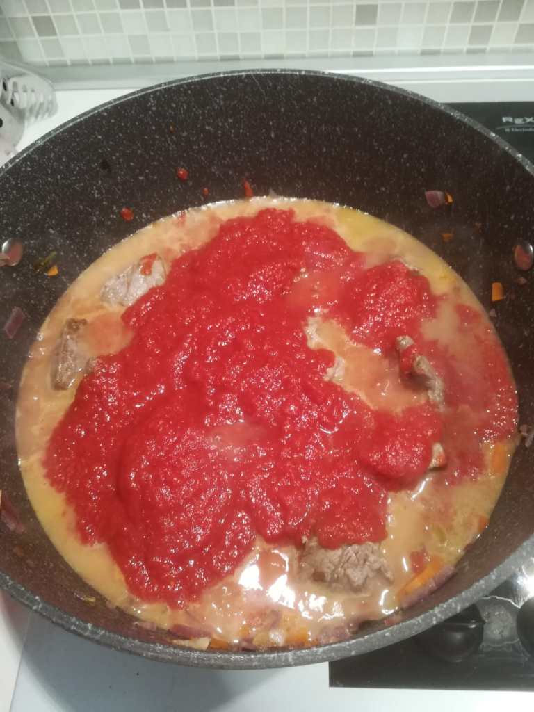 Unire la carne e cuocere a fuoco medio per 20 minuti, sfumare con il vino quindi, aggiungere la passata di pomodoro, il sale il pepe e qualche bacca di ginepro.