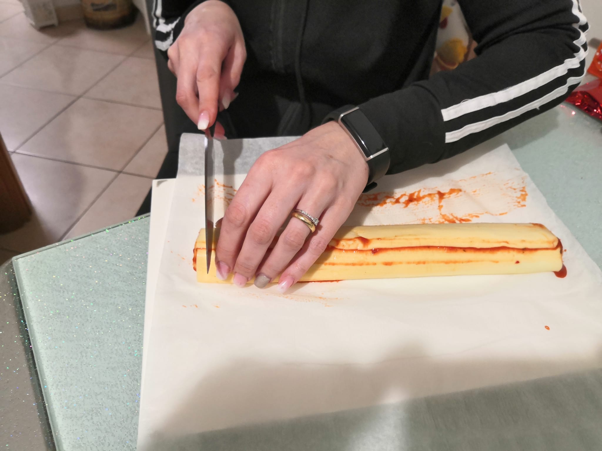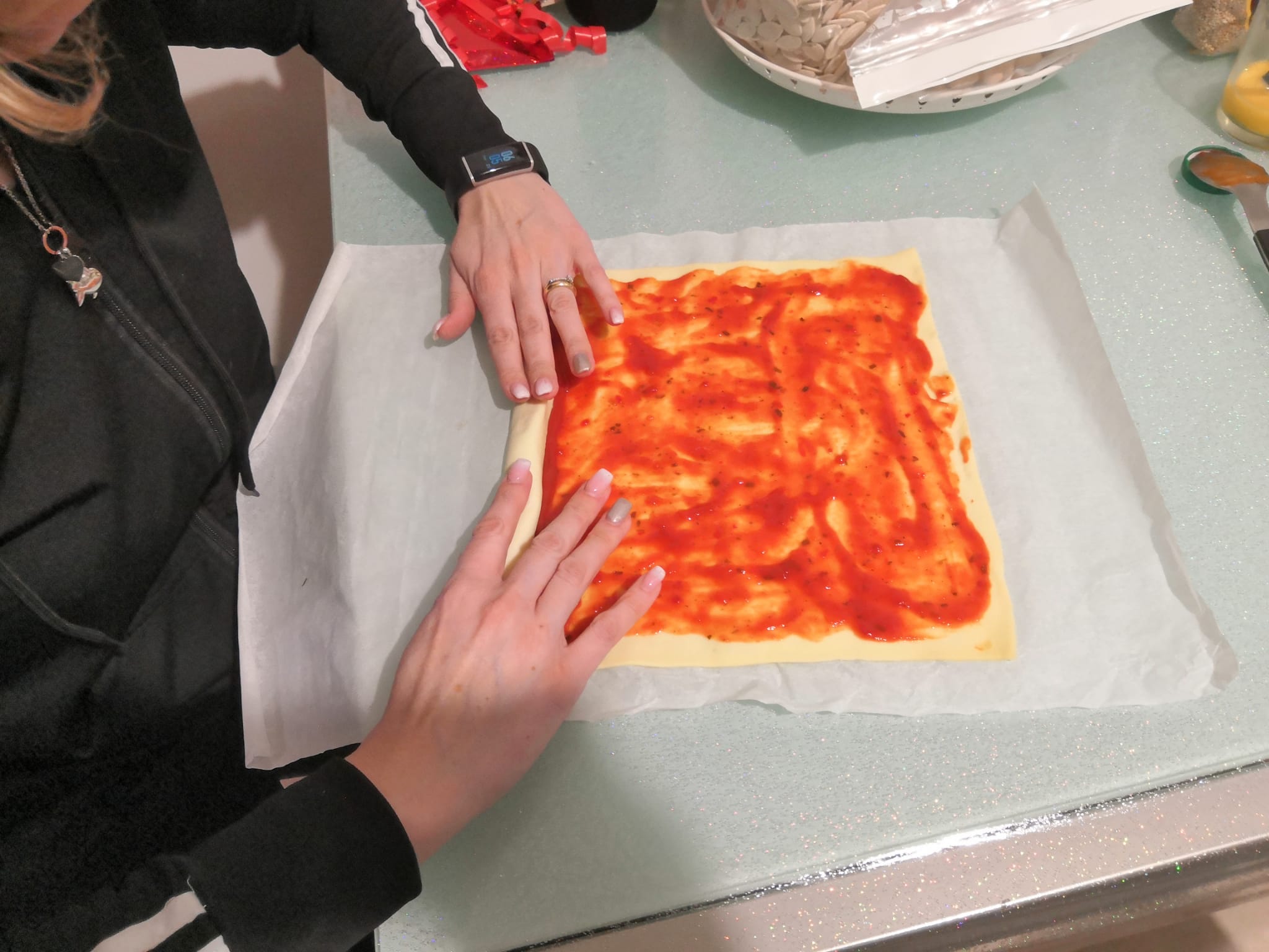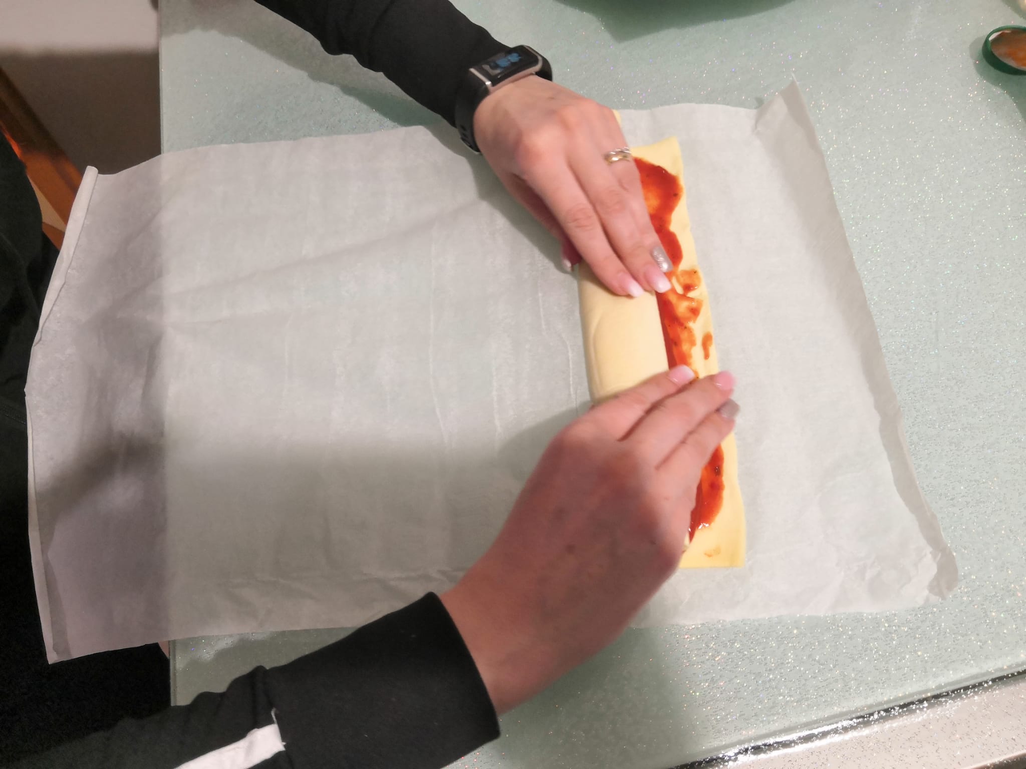 Stendete la pasta sfoglia e cospargete con la salsa usando un cucchiaio. Arrotolate la pasta sfoglia formando un rotolo, quindi tagliate a fette di circa 1 cm, stendete i rotoli su carta forno e mettete in forno ben caldo a 200 °C per 20/25 minuti. Non vi preoccupate se durante il taglio i dischi perdono la forma, una volta in forno la pasta sfoglia si gonfierà.