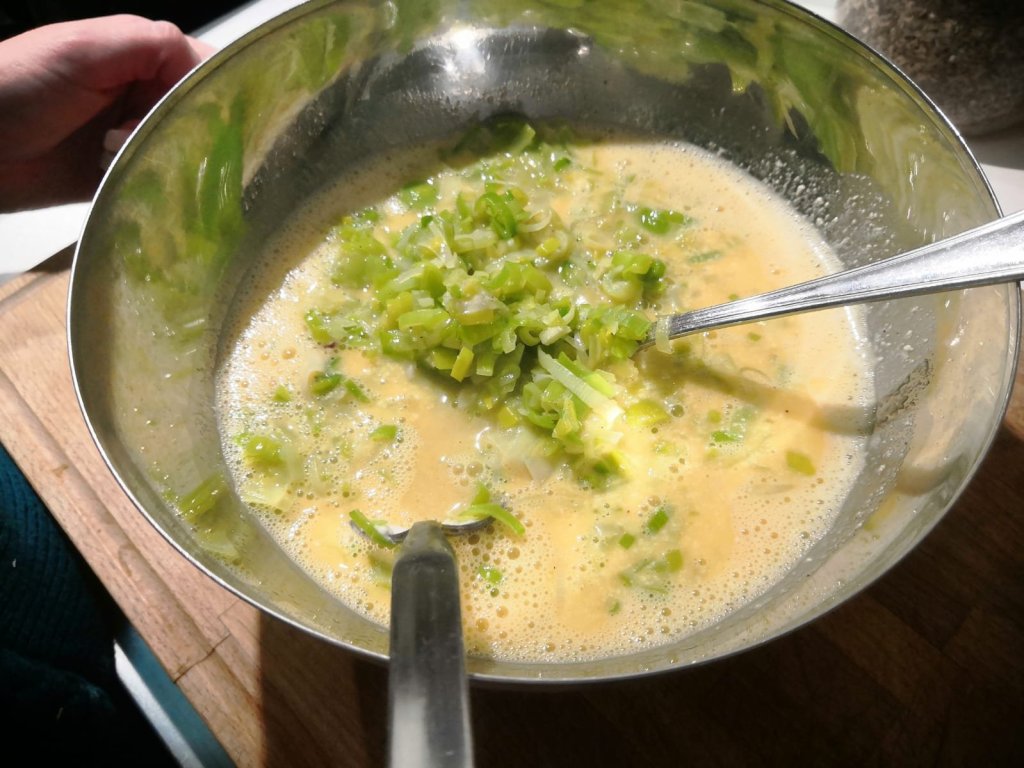 In una ciotola sbattere le uova con la ricotta, il sale ed il pepe e poi aggiungere i porri.