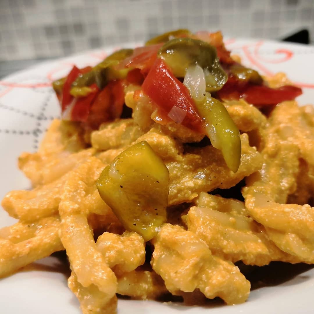 Impiattate ed aggiungete i peperoni rimasti su ogni piatto.