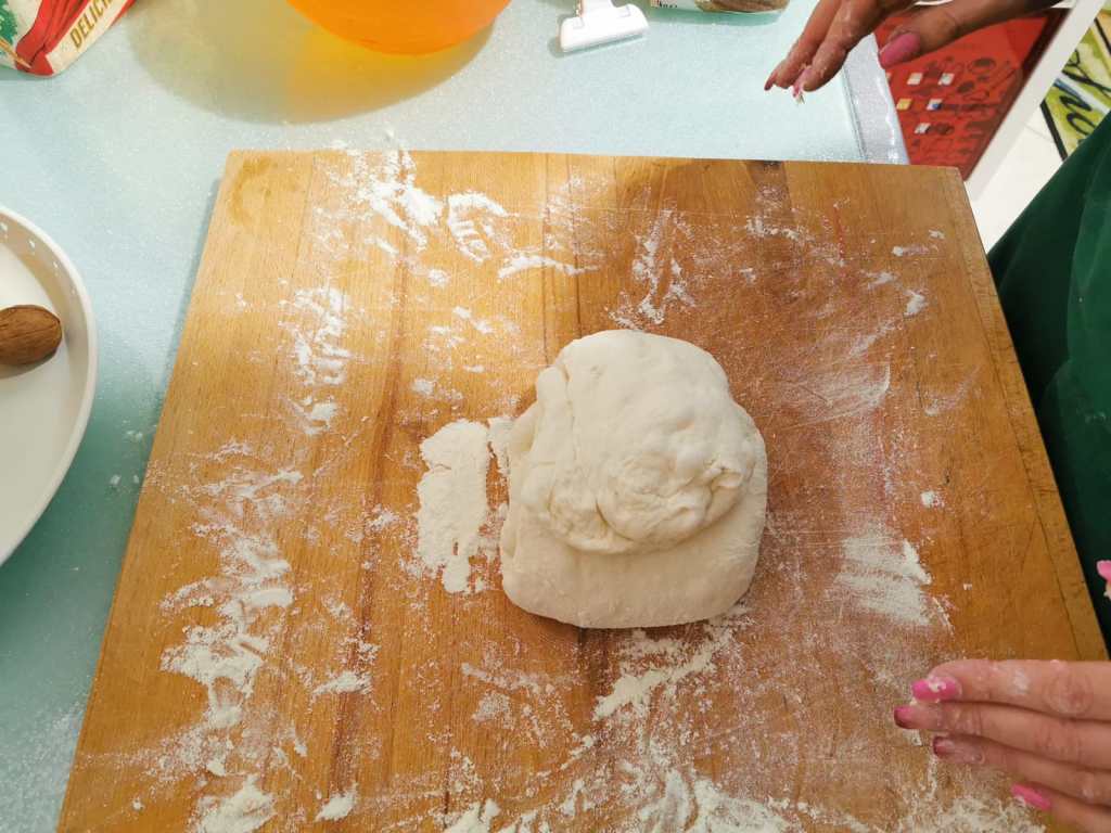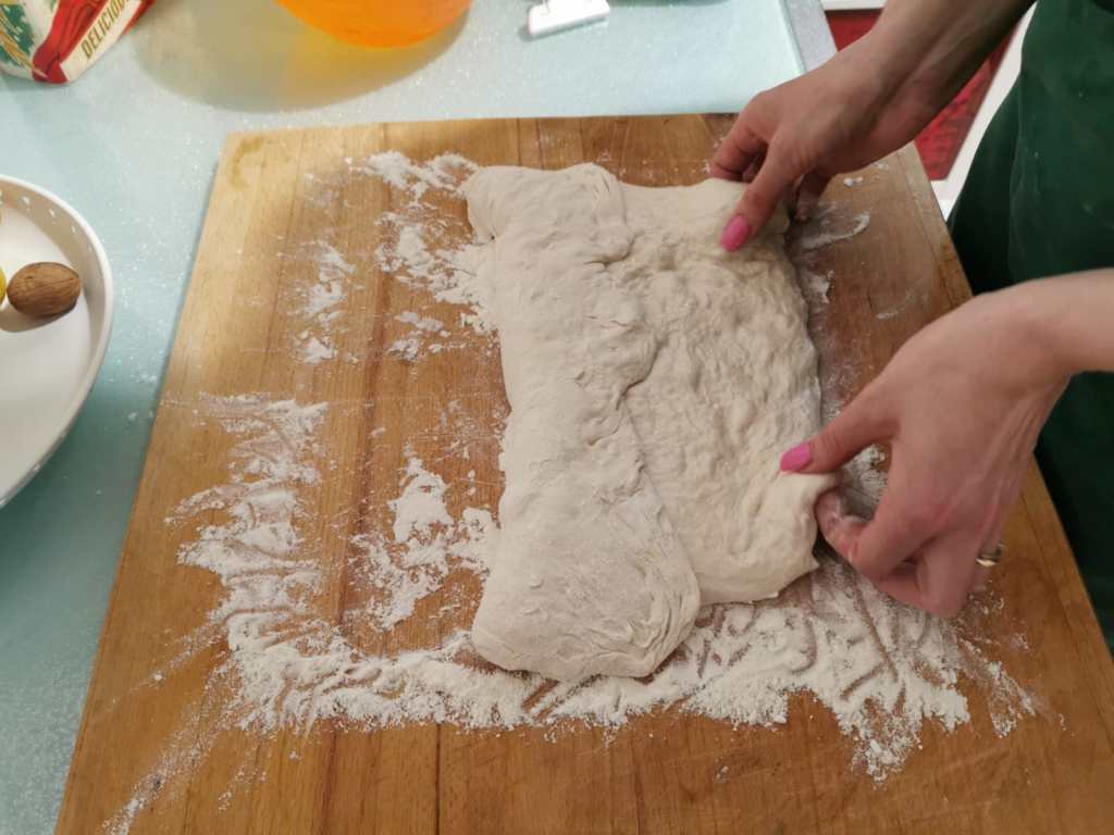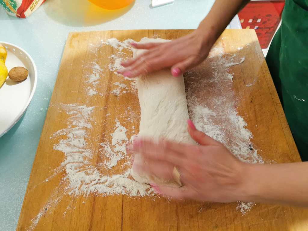 Tirate fuori l’impasto dal frigo ed adagiatelo su un tagliere di legno infarinato formando un rettangolo e chiudete i lembi da tutti i lati per 2 volte consecutive.