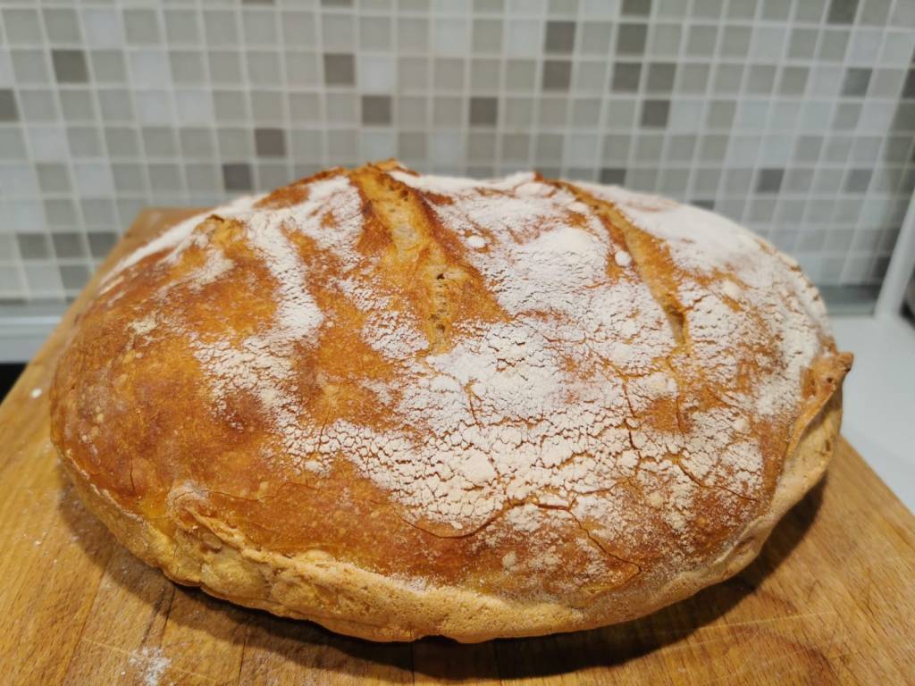 Preriscaldare il forno a 230 gradi ventilato e mettete a scaldare una pentola di coccio, acciaio, pirex o ghisa con coperchio per 10 minuti, dopodiché mettete l’impasto dentro la pentola (facendo attenzione a non bruciarvi) e cuocere per 30 minuti a 230 gradi con coperchio e poi a 220 per 20 minuti senza coperchio.