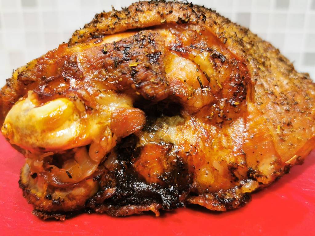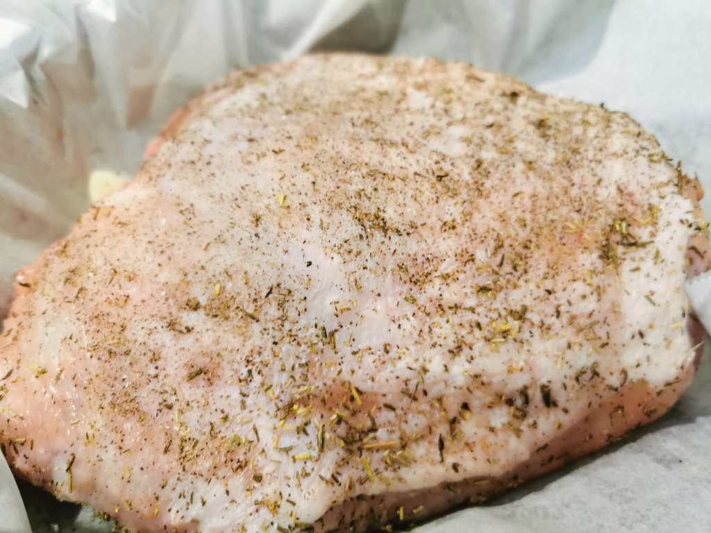 In un mortaio o in un mixer tritate un mix di rosmarino fresco o essiccato, sale e pepe e mettete da parte. Pulite lo spicchio d’aglio e dividetelo a metà, quindi sfregatelo su tutta la superficie della carne. Successivamente cospargete la carne massaggiandola su tutta la superficie con il trito precedentemente preparato. Mettetelo in una teglia rivestita di carta forno ed aggiungete l’aglio usato prima.