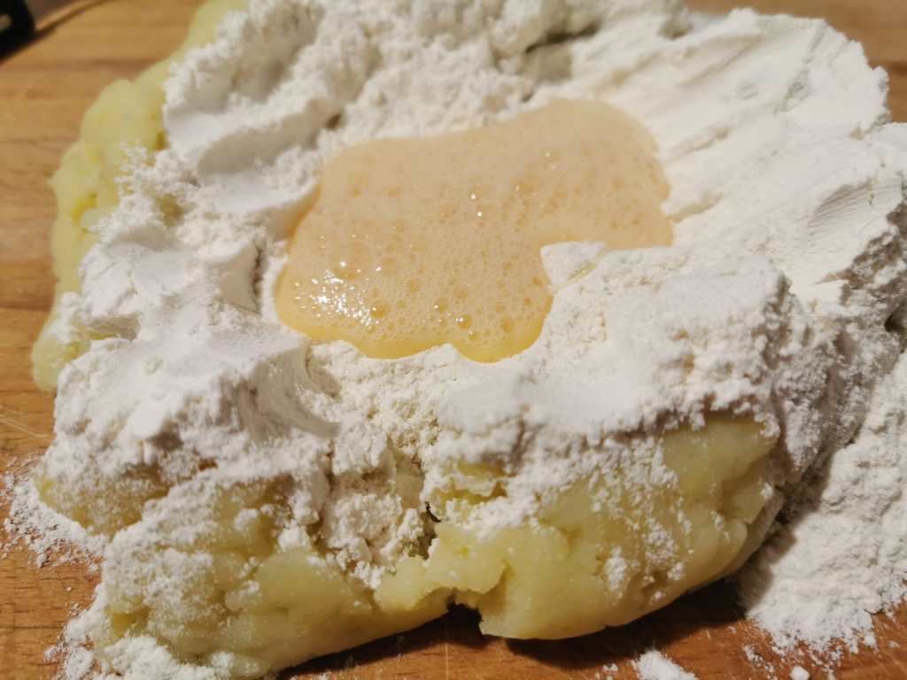 Lessate le patate (è preferibile usare patate vecchie) con la buccia (ci vorrà circa mezz’ora) ed una volta pronte sbucciatele e lasciatele raffreddare completamente in uno scolapasta in modo da fargli perdere i liquidi in eccesso. Una volta fredde passatele con un passaverdura o uno schiacciapatate. Su una spianatoia di legno mettete la farina e formate un buco al centro dove metterete le patate e l’uovo sbattuto.