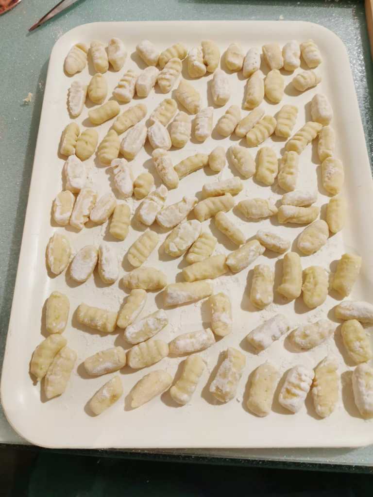 Impastate velocemente in modo tale da ottenere un composto omogeneo e morbido. Non usate ulteriore farina mentre impastate al massimo una spolverata altrimenti gli gnocchi diventeranno duri. Formate dei rotolini con l’impasto di un diametro uniforme di 2 cm e con un coltello tagliateli a pezzetti di 1,5 cm circa. Passateli su una forchetta per formare dei solchi o con l’attrezzo apposito e disponeteli su un vassoio leggermente infarinato stando attenti che non si attacchino l’uno con l’altro.