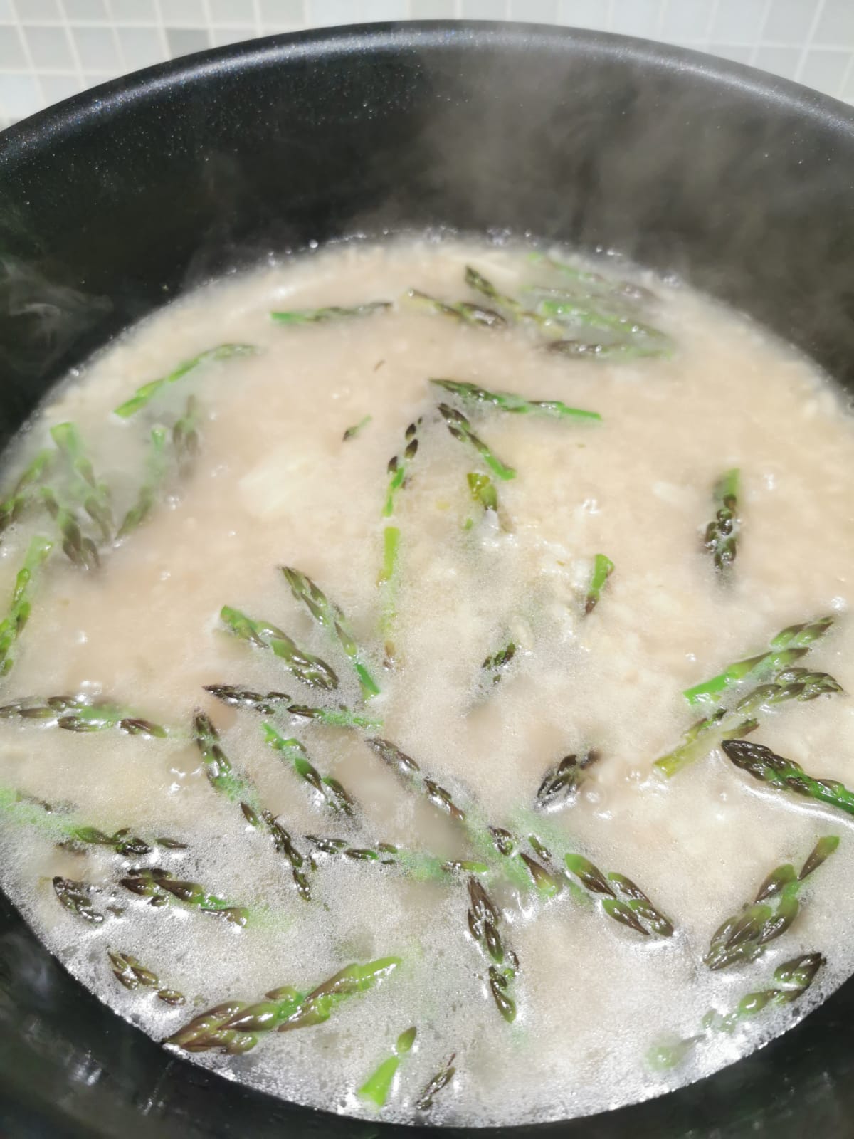 Fate in modo che il riso sia totalmente coperto, noi avevamo preparato un brodo vegetale ( 1 l di acqua, 1/2 carota, 1/2 cipolla, 1 costa di sedano ed un cucchiaino di sale). Noi abbiamo usato un riso integrale con una cottura di circa 45 minuti, dopo circa 30 minuti di cottura abbiamo aggiunto le punte degli asparagi e lasciato andare per altri 10 minuti.