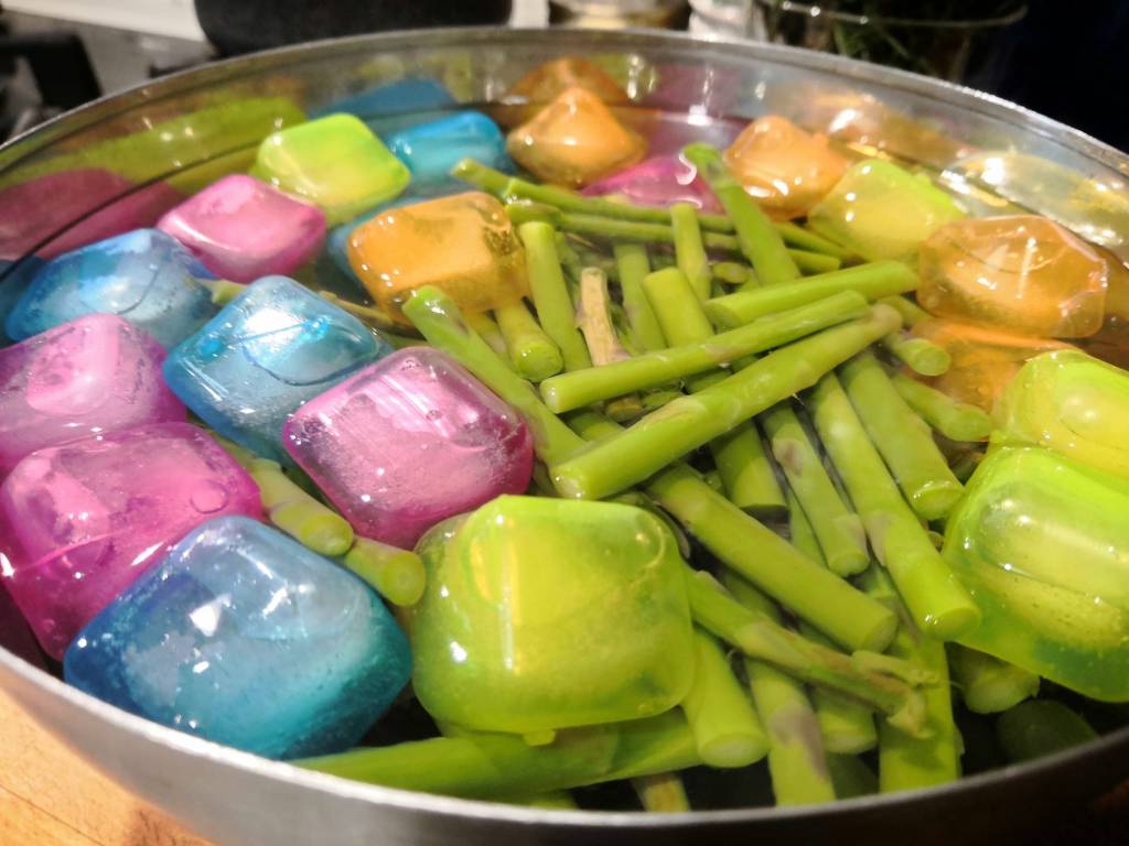 Una volta lessati i gambi metteteli subito in acqua ghiacciata per lasciare intatto il colore verde brillante noi abbiamo usato dei ghiacci di silicone.
