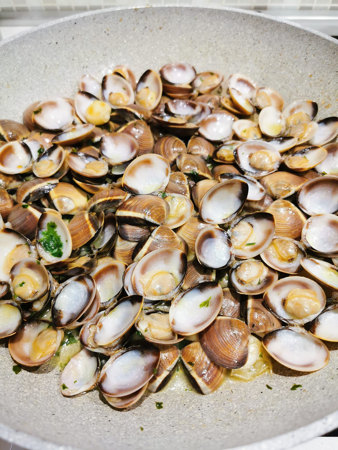 Sfumate il tutto con il vino bianco. Scolate la pasta e saltatela in padella insieme alle vongole ed aggiungete del prezzemolo fresco tritato.