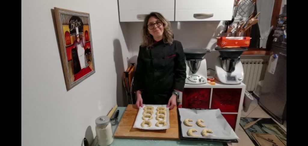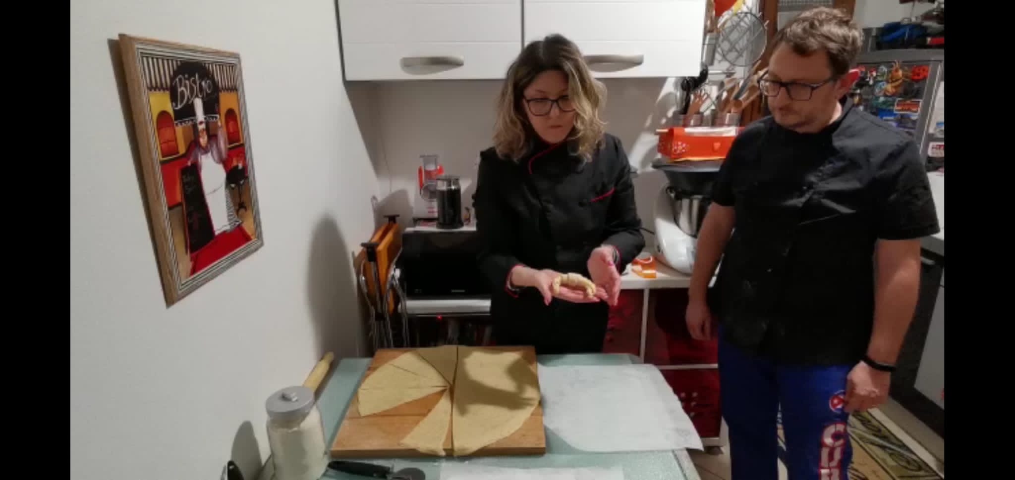 Per i cornetti, tagliate la sfoglia in 12 triangoli con l’aiuto di una rotella taglia pasta, ognuno dei quali dovrete arrotolarlo partendo dalla parte più larga verso la punta per formare il cornetto.