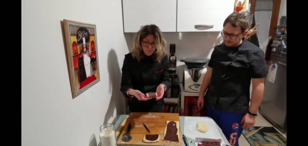 Proseguite cosi per tutti i rettangoli (noi abbiamo effettuato dei tagli trasversali con un bisturi da cucina, ma potete utilizzare anche un coltello affilato, sulla superficie per dare un effetto striato visto che l’ultima sfoglia è al cacao). Una volta terminato di dare la forma ai croissant, vanno lasciati a lievitare su una teglia da forno ricoperta da carta forno per tutta la notte se li volete mangiare per colazione.Se invece li volete conservare ed utilizzare in seguito li potete mettere subito al congelatore e tirare fuori circa 8/10 h prima della cottura.