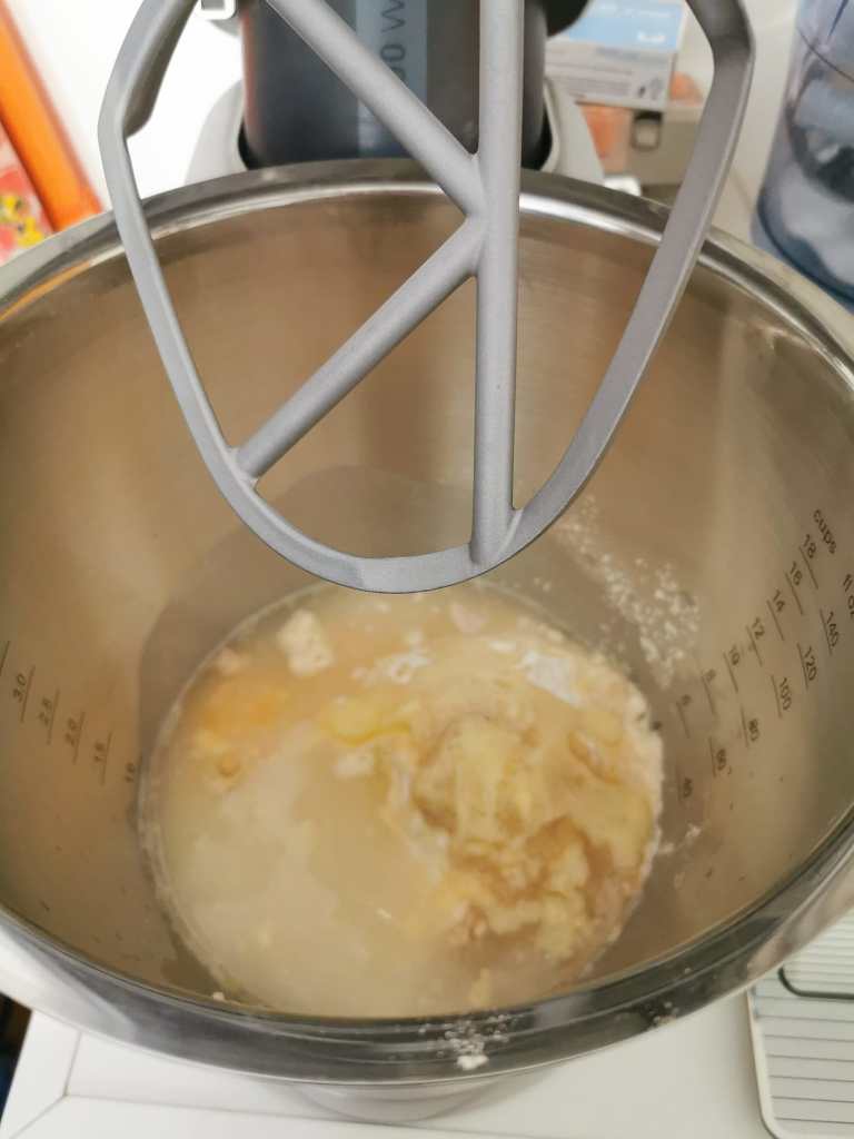 In una planetaria unire la farina, lo zucchero, il lievito, il burro morbido e l’acqua tiepida ed iniziate ad impastare con l’accessorio k. Appena inizia a formarsi l’impasto aggiungete il sale e continuate ad impastare per 2 minuti dopodiché sostituite la k con il gancio da impasti e continuate a lavorarlo per altri 6 minuti.