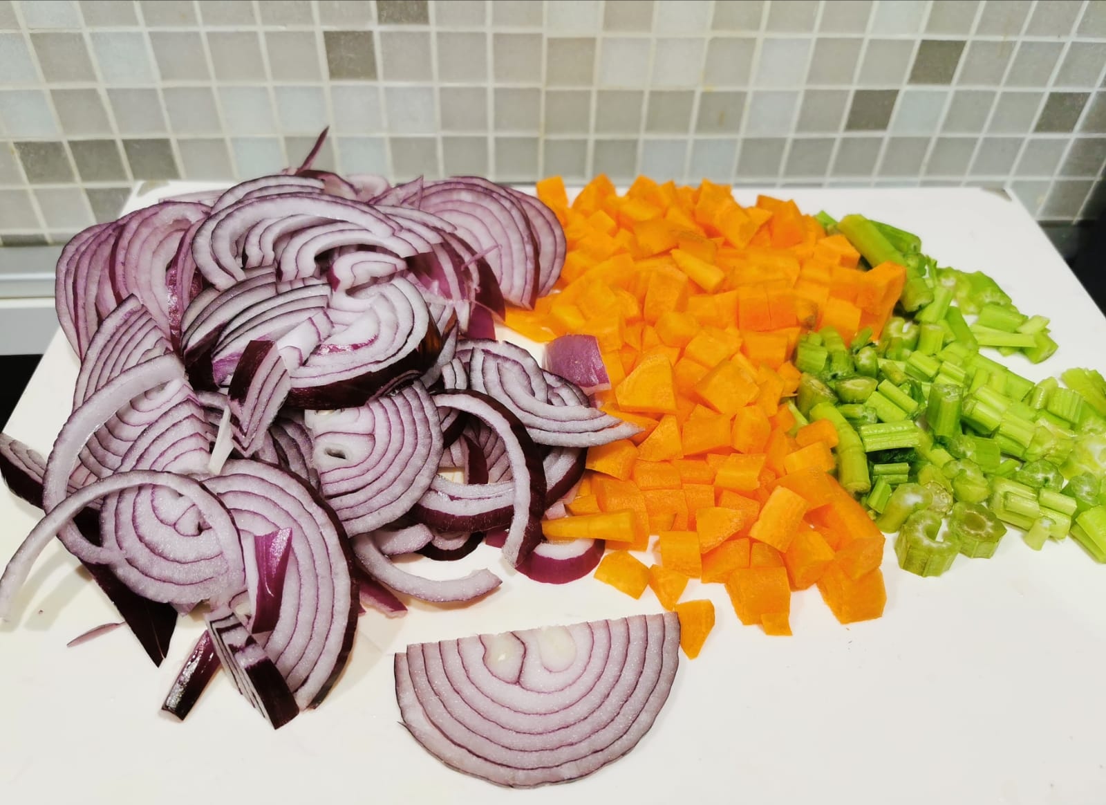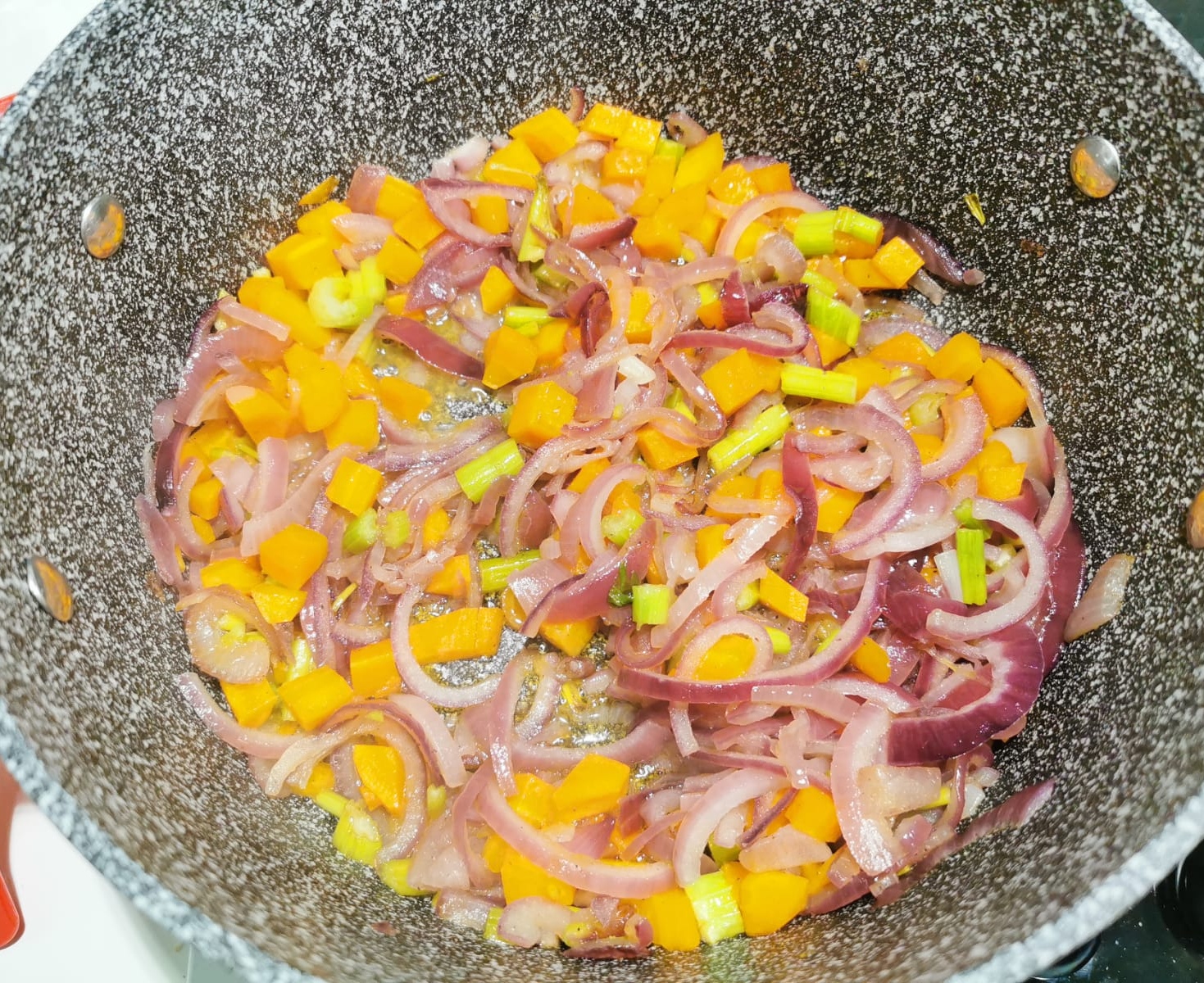 In una casseruola fate soffriggere le verdure lavate e tagliate a cubetti con dell’olio di oliva.