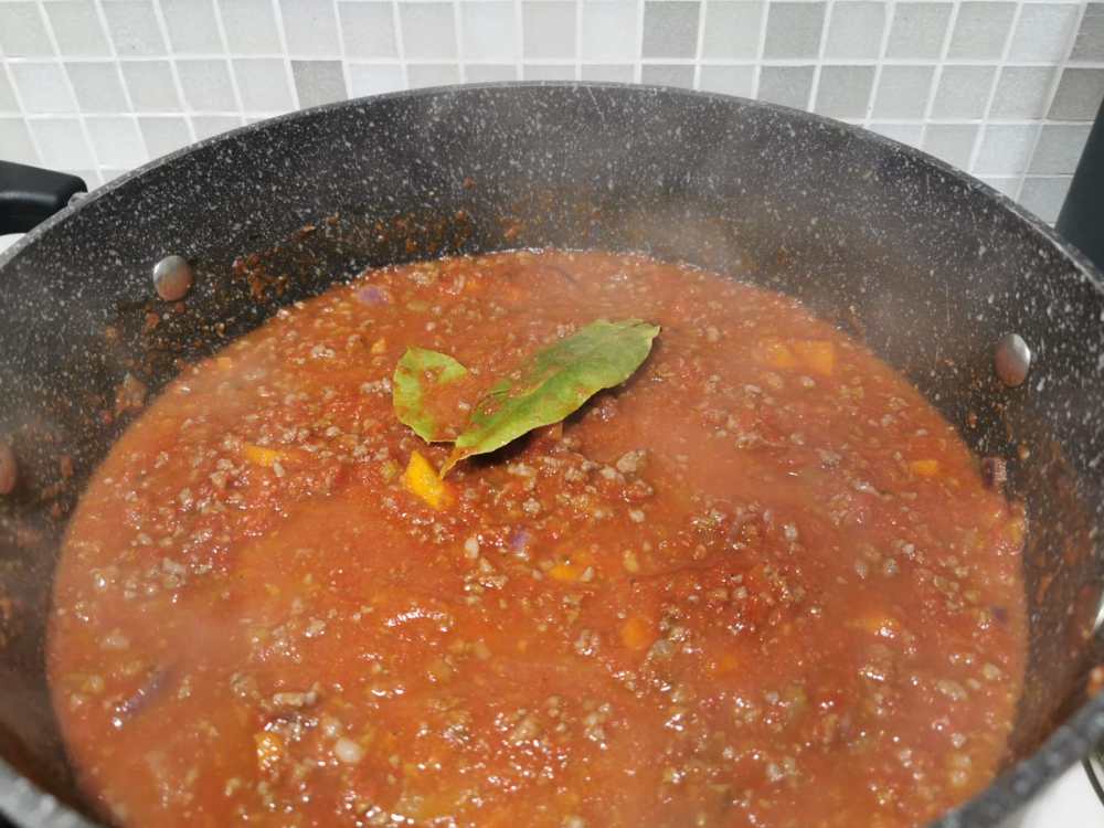 Successivamente sfumate con il vino rosso mantenendo alta la fiamma. Aggiungere poi la passata di pomodoro ed aggiustare di sale e pepe. Se necessario aggiungere dell’acqua. Dopo circa 30 minuti aggiungete le foglie di alloro. Coprire con un coperchio e continuate la cottura a fuoco lento per tre ore mescolando ogni tanto.
