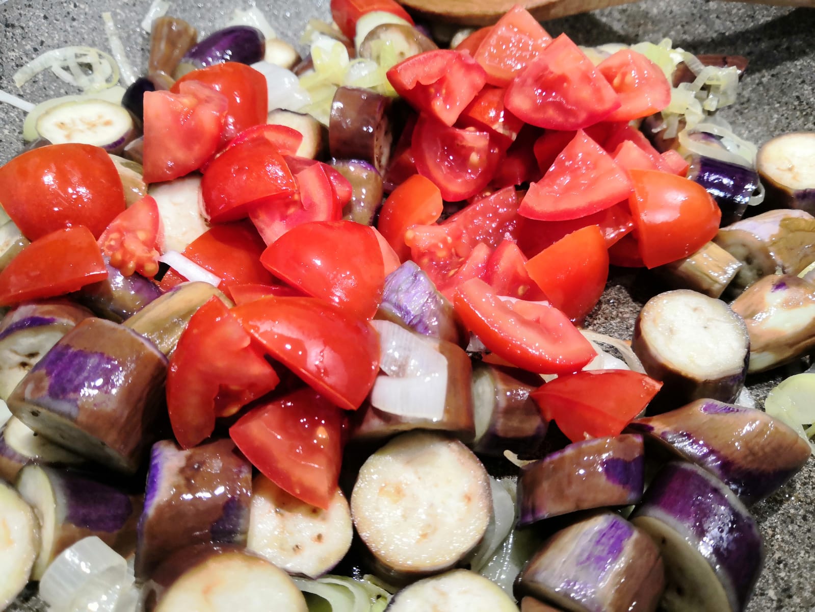 Una volta stufato il porro aggiungete le melanzane e fate cuocere per circa 10 minuti mescolando ogni tanto ed aggiungendo un po’ di pepe, evitate il sale visto che le melanzane sono già state salate in precedenza. Infine aggiungete i pomodorini e fate cuocere a fuoco lento e coperto per circa 15 minuti.