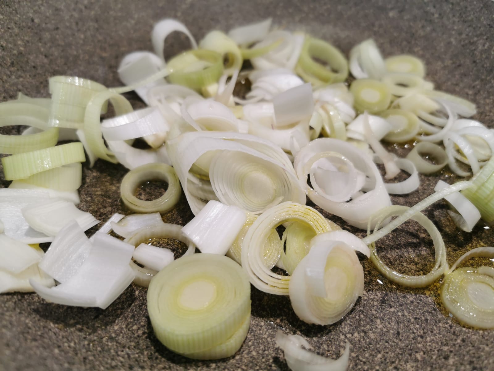 Una volta asciugate le melanzane fate appassire il porro in una padella con dell’olio facendo attenzione che non si bruci, se volete potere aggiungere un po’ di acqua per un soffritto più leggero.