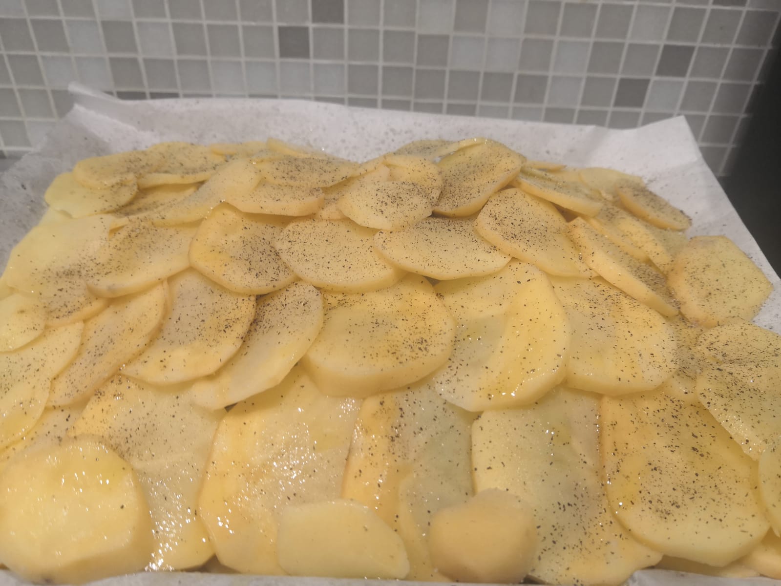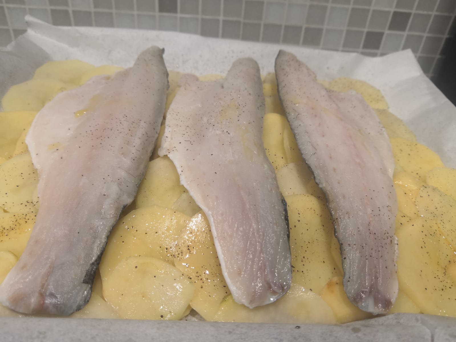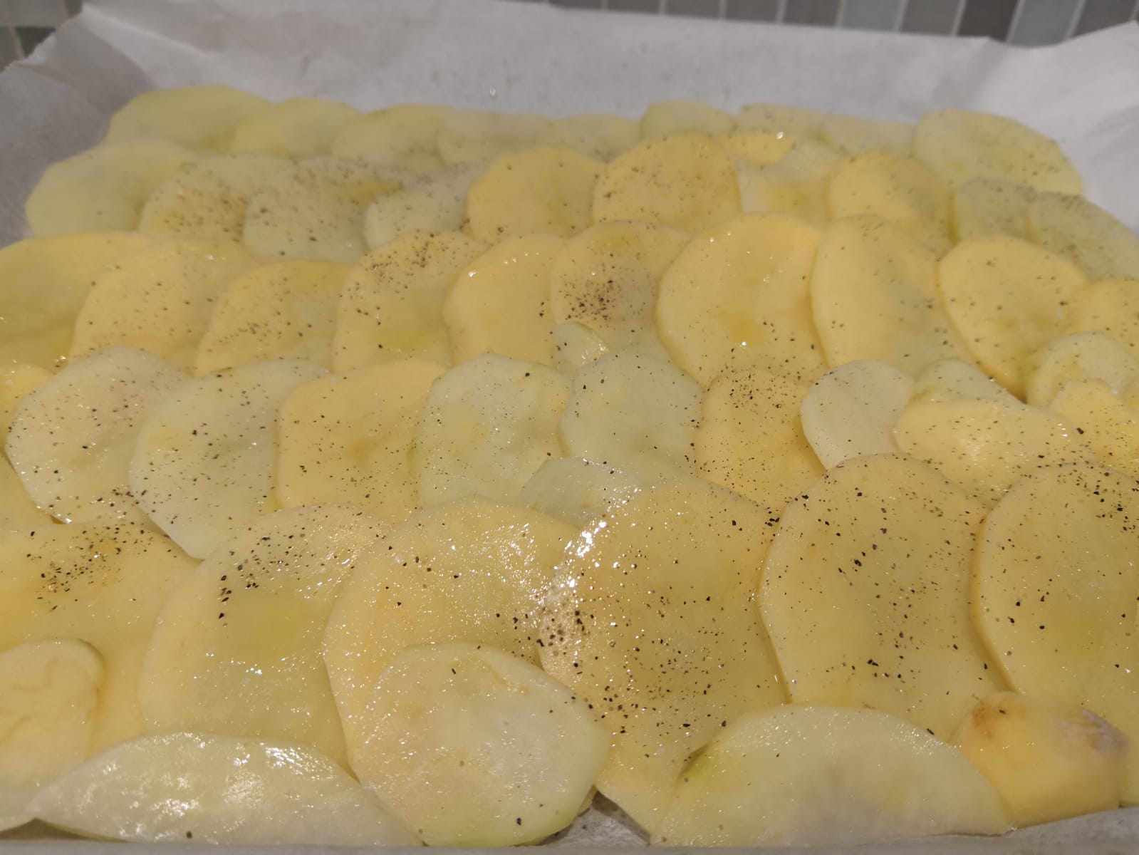 Disponete un primo strato di chips su una teglia ricoperta di carta da forno e condite con sale e pepe, dopo di che adagiate il filetti sulle patate , salate e pepate poi coprite il tutto con un nuovo strato di chips e cospargete con sale, pepe ed olio d’oliva.