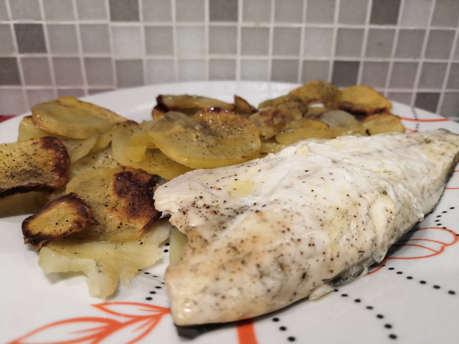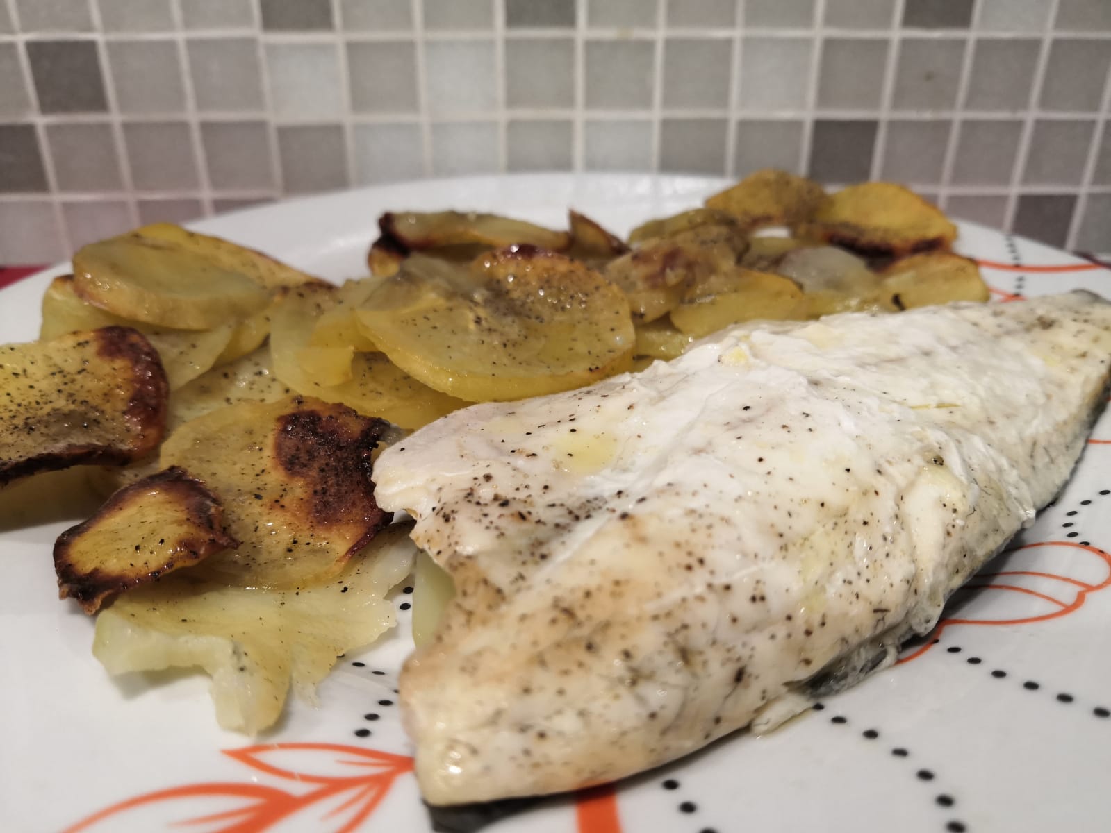 Dopodiché scoprite e fate cuocere per altri 5 minuti, il pesce sarà cotto e potrete impiattare con le patate appena sfornate.