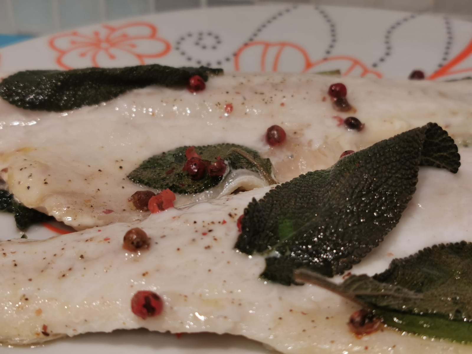 Nel frattempo mettete in una padella mettete olio ed uno spicchio d’aglio e fate soffriggere per circa 2 minuti, dopodiché aggiungete i filetti mettendoli con la parte della pelle sull’olio aggiungete sale, e lasciate andare per 5 minuti, dopo di che aggiungete salvia e pepe rosa e coprite per altri 5 minuti.