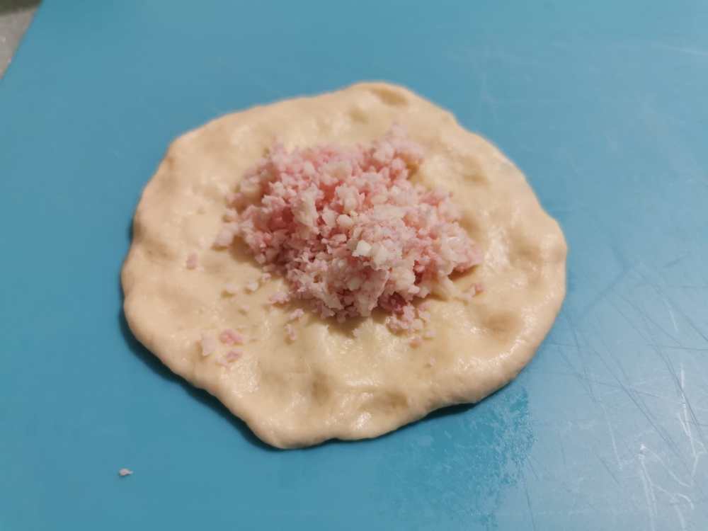 Trasferite l’impasto in una ciotola, copritelo con la pellicola alimentare e lasciatelo lievitare nel forno spento con la luce accesa fino al raddoppio per circa 2 ore. Successivamente mettetelo su una spianatoia, non occorrerà infarinare. Dividetelo in panetti da 45 g ciascuno e disponeteli via via sulla superficie di lavoro, coprendoli con un canovaccio inumidito. Stendeteli uno alla volta in un disco e farcitene alcuni con la pancetta arrotolata e la scamorza. Riportate i lembi di pasta verso il centro in modo fa formare una pallina.