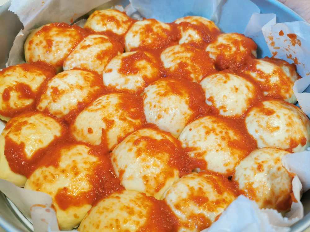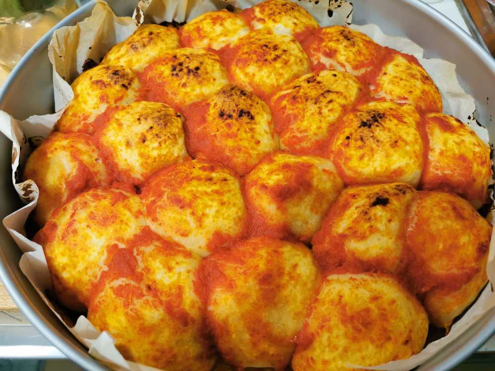 Farcite le palline restanti con il prosciutto cotto e la fontina. assicuratevi che le palline siano ben chiuse e mettetele all’interno di una teglia da 28 cm di diametro rivestita di carta forno. Disponetele inizialmente lungo la circonferenza più larga e poi in quelle più interne fino ad arrivare al centro. Fate lievitare coprendo con un canovaccio per 1 h circa, fino a quando non ci saranno più spazi vuoti tra una pallina e l’altra.