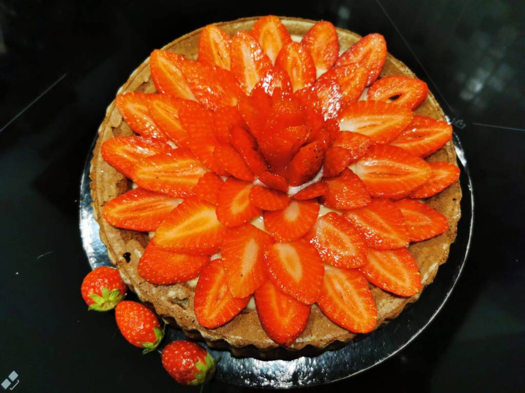 Versate il composto preparato in uno stampo “furbo” per crostate e cuocete in forno statico a 180°C per 20-25 minuti. Trascorso il tempo sfornatela e fatela raffreddare, dopodiché rovesciatela e farcitela con la crema preparata, tagliate le fragole a fette e farcite dando la forma che preferite.
